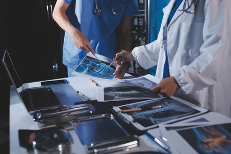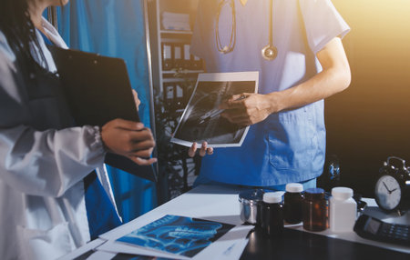 Doctors meet to discuss healthcare records and x ray scans results at treatment center. Licensed medics focus on tests for disease prevention, demonstrating teamwork and expertise. Camera A.
