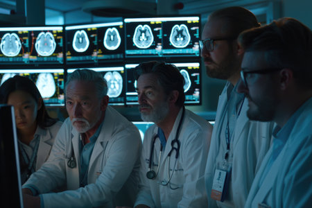 Doctors collaboratively examine brain scans in a high-tech healthcare setting.