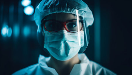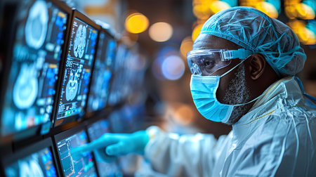 Expert surgeon in protective workwear and mask examines bacterium indoors generated by artificial intelligence