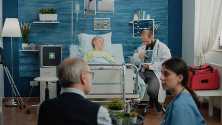 Sick aged patient looking at tablet with osteopathy x ray for diagnosis checkup in nursing home. Doctor explaining radiography scan to old ill woman for healthcare recovery treatment.