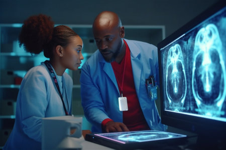 Mixed-race radiologist and his African female assistant analyzing x-ray image
