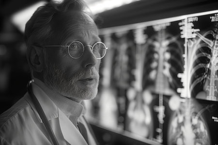 A stylish blackandwhite photo of a doctor wearing glasses analyzing an xray. The monochrome photography captures the wrinkles on his face as he stands on a street