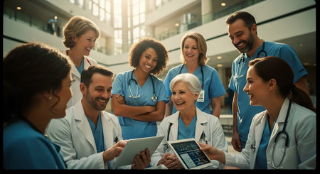 A female doctor in a white coat and stethoscope uses a tablet, surrounded by a diverse group of medical professionals in blue scrubs and lab coats in a bright hospital setting.