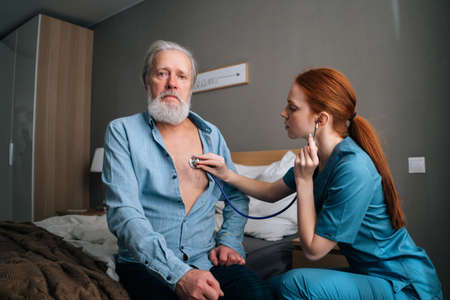 Focused female nurse holding stethoscope listening lungs old senior male patient sitting on bed at home. Cardiologist physician checking elderly man heartbeat at checkup medical visit in hospital room