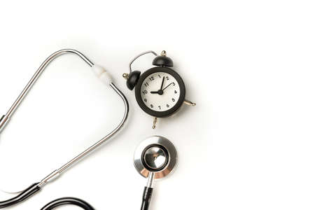 Stethoscope and alarm clock isolated on white background closeup. The concept of the need for timely medical diagnosis.