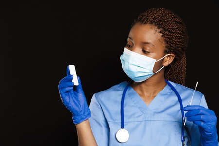 Black doctor wearing face mask posing with covid test isolated over dark background
