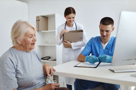 an elderly woman sitting at a doctors appointment with a nurse treatment