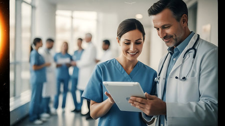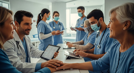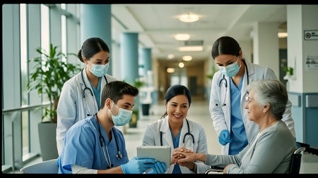 A diverse group of medical professionals, including doctors and nurses, gathered around a tablet, reviewing patient data in a modern hospital setting with a clean and sterile environment.