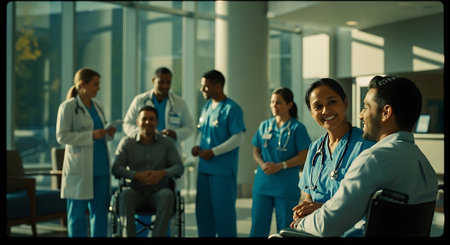 A diverse group of medical professionals, including doctors and nurses, interact with a patient in a wheelchair in a modern hospital lobby with large windows.