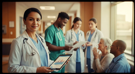 A female doctor in a white coat holds a tablet, standing in a hospital corridor with a diverse medical team and patients, conveying a sense of healthcare and professionalism.