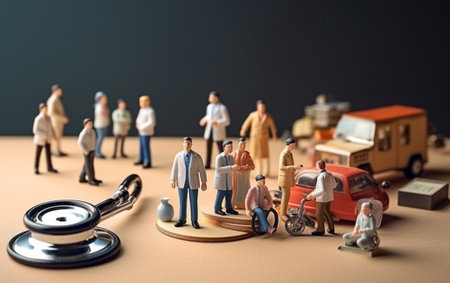 A diverse group of medical professionals, including doctors and nurses, sit in a hospital room with a patient, conveying a sense of care and teamwork in a healthcare environment.
