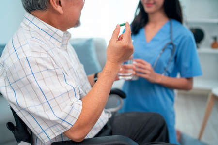 Asian senior man hold medicine pill and discuss with nurse or doctor during homecare service.