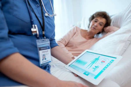 Digital Tablet Showing Test Results of Elderly Female Patient Lying in Bed in the Background. Closeup of Digital Tablet With Medical Healthcare Software Application Showing Medical Records.
