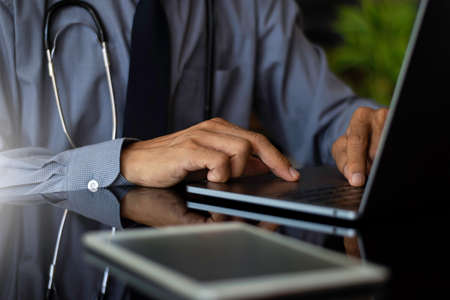 .Male doctor hands typing on laptop computer keyboard, searching medical information with digital tablet pc on the desk at office. Online medical, medic tech, emr, ehr, telehealth, meditech concept.