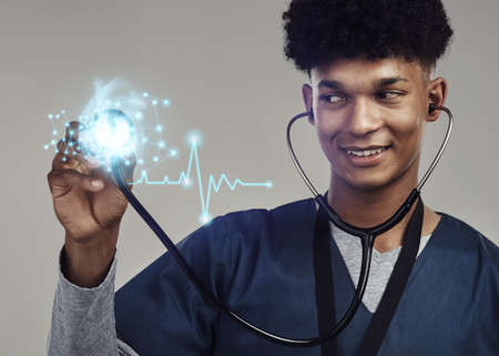 Its so rewarding to make a difference in someones life. Shot of a male nurse holding up a stethoscope while standing against a grey background.