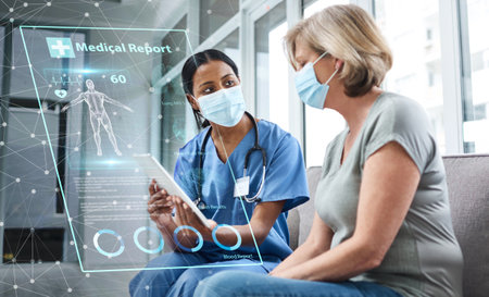 Doctor, patient and tablet with future technology and health, digital medical report and women in face mask with Covid. Anatomy, hologram and 3D with healthcare, consultation and overlay in hospital