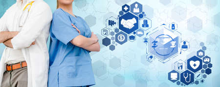Medical Healthcare Concept - Doctor in hospital with digital medical icons graphic banner showing symbol of medicine, medical care people, emergency service network, doctor data of patient health.