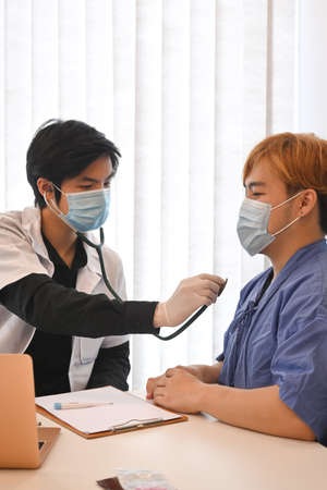 healthy concept; Doctor checking patient's heart with stethoscope at a hospital