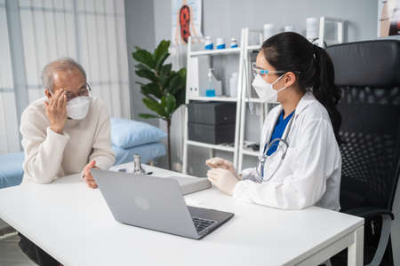 Asian senior man patient visit and consult health problem with doctor. Attractive therapist practitioner explain diagnosis in office hospital to give treatment to elderly older male during appointment