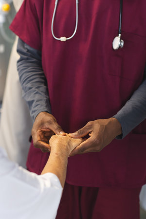 Midsection of african american male doctor examining hands of senior female caucasian patient. Hospital, work, medicine and healthcare.