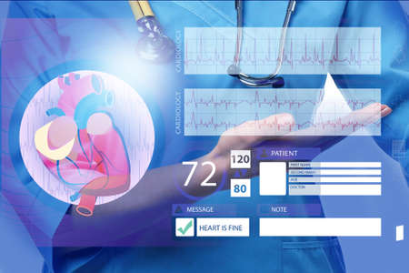Closeup view of doctor with stethoscope and illustration of cardiological diagnostic app interface