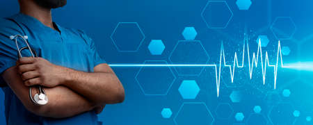 Medican research. Collage with black male doctor, hexagonal cells and cardiogram over blue background, free space. Web banner