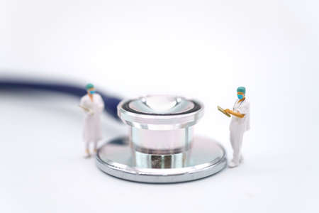 Healthcare Concept. Closeup of two doctor miniature figureห with patient file standing with Stethoscope on white background.