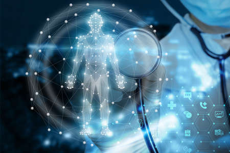 Accurate diagnosis appropriate treatment medical concept.Doctor hand working with stethoscope and laptop computer digital tablet with virtual dashboard interface