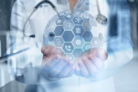 Health care and medical technology services concept with flat line AR interface.Medical co working concept,Doctor working with smart phone and digital tablet and laptop computer to meeting his team.