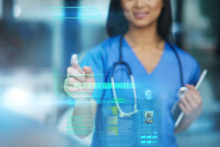 Medical technology concept. the doctor presses virtual option on tablet