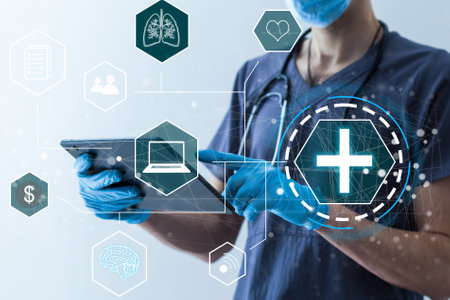 Data Security system Shield Protection Verification concept.Doctor hand working with stethoscope and laptop computer digital tablet with virtual dashboard interface