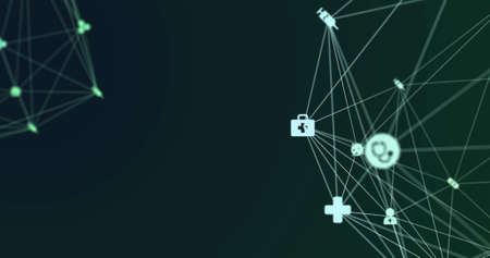 Image of digital interface and globe of network of connections with white icons turning on green background. Global computer network concept digitally generated image.