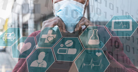 Digital illustration of a man taking a face mask off, walking on a street over medical icons, data processing, statistics showing in the background. Medicine public health pandemic coronavirus Covid 19 outbreak concept digital composite.