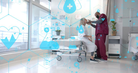 Image of network of medical icons over diverse male doctor giving senior female patient check up. Data, digital interface, connection, hospital and healthcare, digitally generated image.