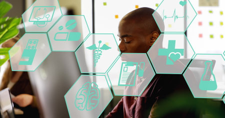 Image of scientific icons in hexagons over african american male scientist using computer. Science, medicine and laboratory concept digitally generated image.