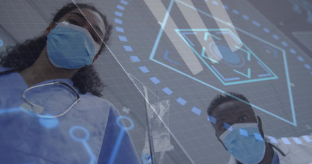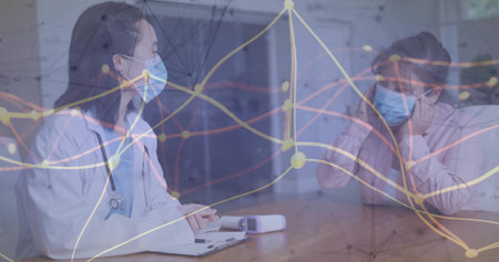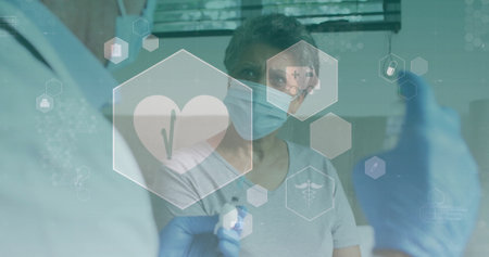 Gesturing doctor wearing lab coat at hexagonal interface with masked patient in consultation room. Telemedicine, healthcare, digital, professional, modern, consultation, innovation