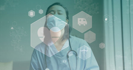Pausing nurse in blue scrubs, surgical mask standing in clinic, with stethoscope and digital icons. Medical, healthcare, professional, clinical, wellness, diagnostic, technology