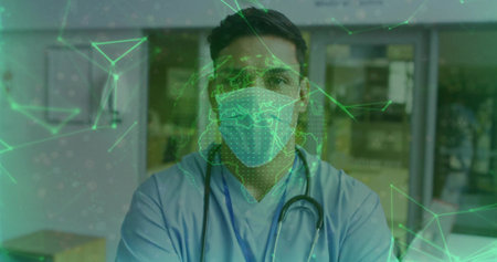 Standing doctor crossing arms in clinic corridor, with scrubs stethoscope mask and green overlay. Medical, healthcare, professional, digital, communication, technology, clinical