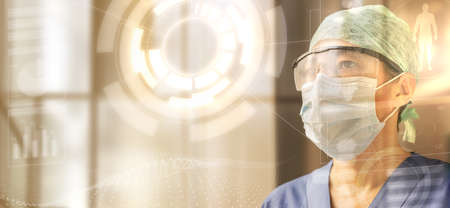 portrait of a female doctor wearing cap, glasses and protective mask looking at a transparent digital screen, concept of the future of medicine and medical technology