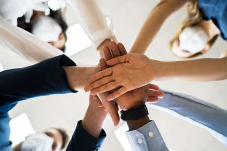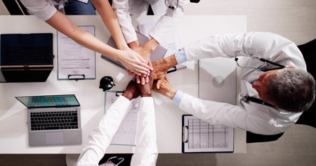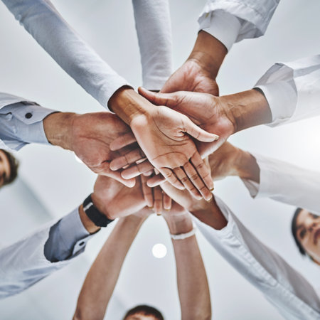 United and diverse multiethnic medical team joining hands in solidarity and cooperation