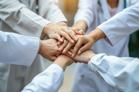 A group of doctors and a medical nurse join their hands together, showcasing the unwavering teamwork and solidarity that drives their collective efforts in the healthcare field