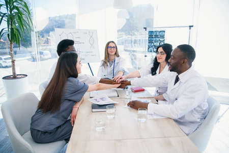 international team of professional doctors having a meeting in conference room at the modern hospital. Healthcare and medical development concept.
