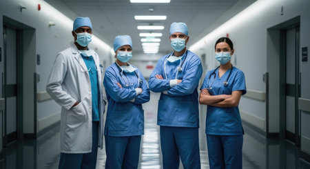 A group of medical professionals, wearing face masks and scrubs, stand in a hospital hallway. The composition features several figures illuminated by overhead lighting. The color palette primarily includes blue and white tones. This image could be suitable for various editorial or commercial applications, depicting healthcare.