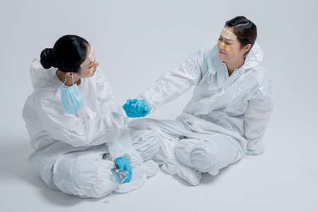 Tired women doctors wearing protective medical masks sitting in clinic corridor