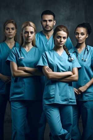 United in Focus: Doctors & nurses in scrubs, unwavering concentration on patient care. AI-generated