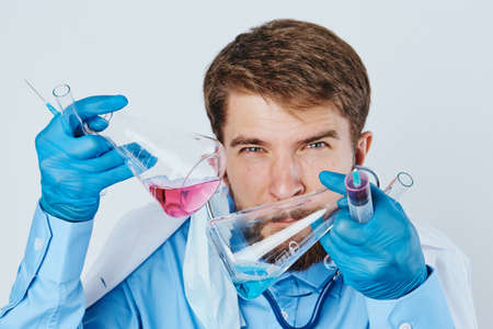 Close-up young chemist, doctor conducts chemical research isolated on blue background. Concept of pharmacology.