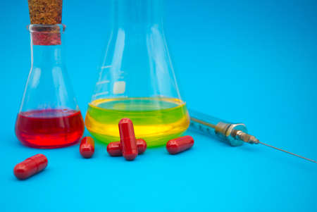 Medical, healthcare or Covid-19 still life with red capsules, hypodermic syringe and chemical solution in a flasks over a blue background
