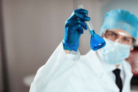 hands of scientists hold a glass tube filled with blue chemical liquid for research and analysis in a laboratory.