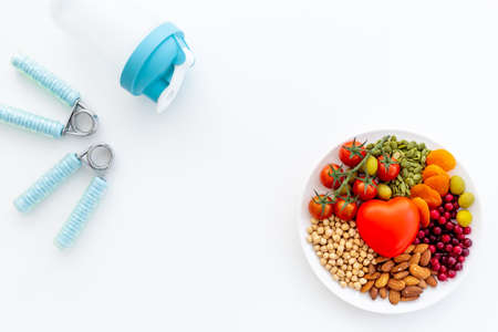 Cholesterol diet concept with Less fat food in plate with heart object