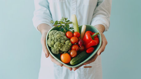 A nutritionist's hand holding a heart-shaped dish of vegetables, encouraging a healthy diet. --ar 16:9 Job ID: 95876ef5-38e7-41b9-bc8a-73917125f139
